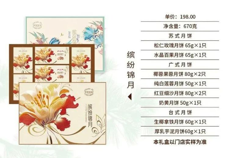 介绍:苏式月饼 松仁玫瑰月饼65gx1只 水晶百果月饼65gx1只 广式月饼 椰蓉果蓉月饼80gx2只 纯白莲蓉月饼50gx1只 红豆细沙月饼80gx2只 奶黄月饼50gx1只 台式月饼 生椰拿铁月饼60gx1只 厚乳芋泥月饼60gx1只