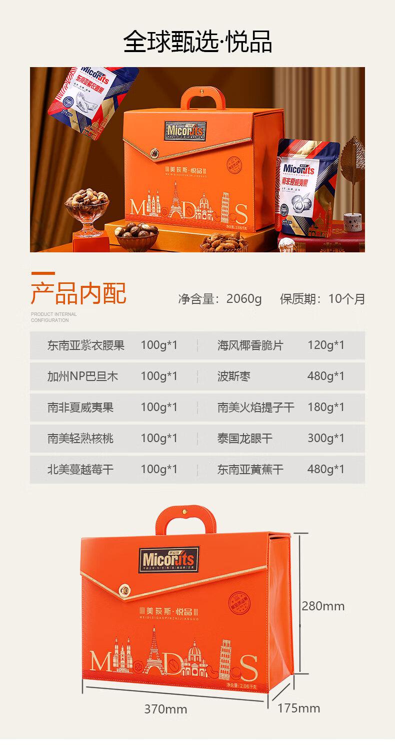介绍:东南亚紫衣腰果100g*1 海风椰香脆片120g*1 加州NP巴旦木100g*1 波斯枣480g*1 南非夏威夷果100g*1 南美火焰提子干180g*1 南美轻熟核桃100g*1 泰国龙眼干300g*1 北美蔓越莓干100g*1 东南亚黄蕉干480g*1