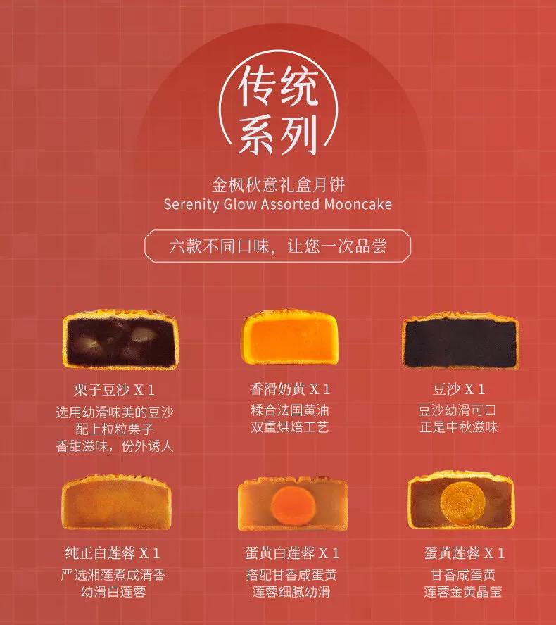 介绍:栗子豆沙月饼*1 豆沙月饼*1 蛋黄白莲蓉月饼*1 蛋黄莲蓉月饼*1 纯正白莲蓉月饼*1 香滑奶黄月饼*1