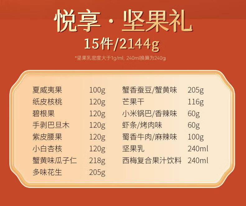 介绍:夏威夷果100g 蟹香蚕豆/蟹黄味205g 纸皮核桃120g 芒果干116g 碧根果120g 小米锅巴/香辣味60g 手剥巴旦木 120g 虾条/烤肉味60g 紫皮腰果120g 蜀香牛肉/麻辣味100g 小白杏核120g 坚果乳240ml 蟹黄味瓜子仁218g 西梅复合果汁饮料240ml 多味花生205g