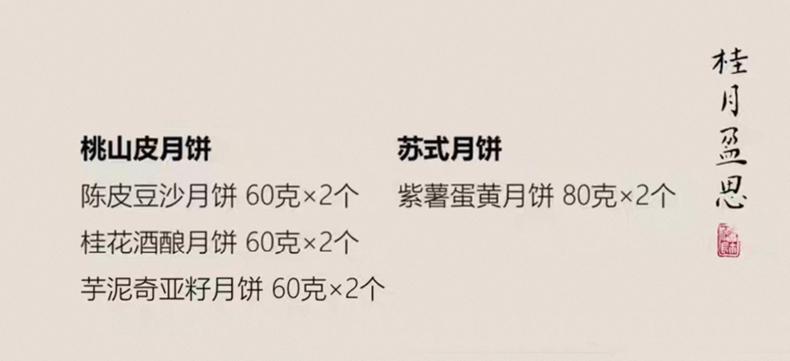介绍:桃山皮月饼 陈皮豆沙月饼60克x2个 桂花酒酿月饼60克x2个 芋泥奇亚籽月饼60克x2个 苏式月饼 紫薯蛋黄月饼80克x2个